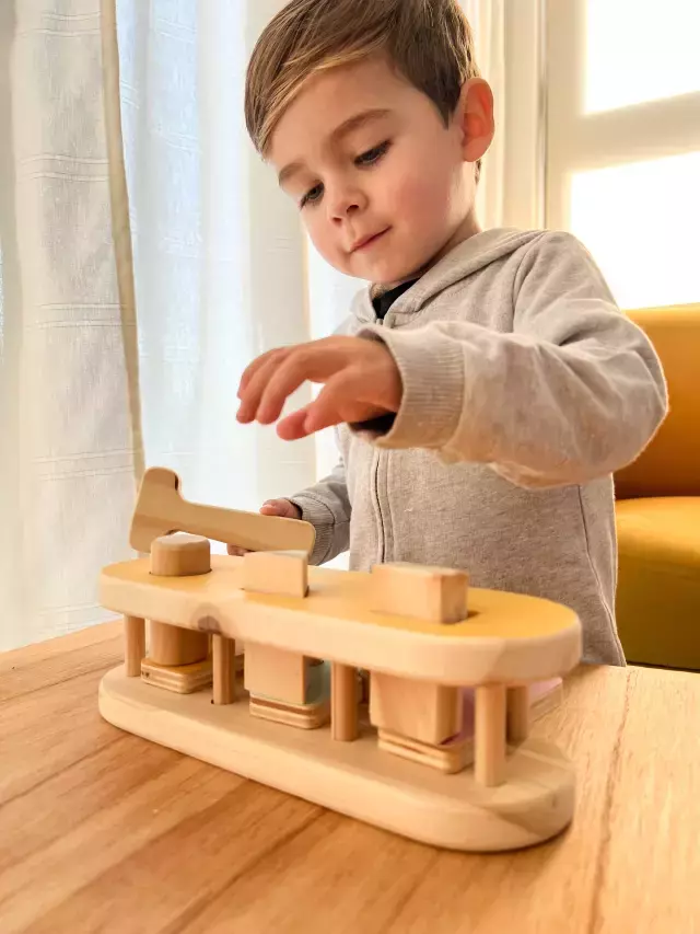 Este banco de descarga estimula muchas áreas cognitivas en los niños: la clasificación de formas, motricidad fina al insertarlas cada una en su lugar y la motricidad gruesa al golpear el martillo en las paletas.