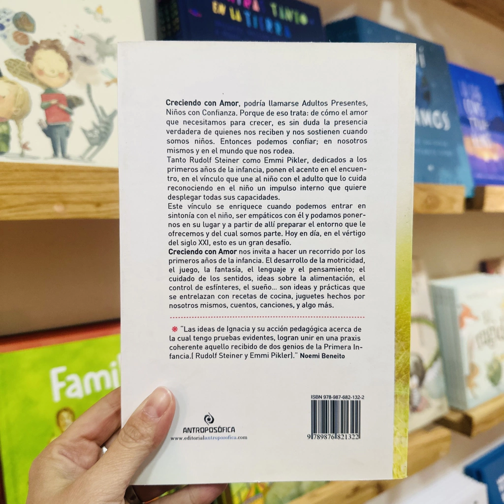 Creciendo con Amor, podría llamarse Adultos Presentes, Niños con Confianza. Porque de eso trata: de cómo el amor que necesitamos para crecer, es sin duda la presencia verdadera de quienes nos reciben y nos sostienen cuando somos niños. Entonces podemos confiar; en nosotros mismos y en el mundo que nos rodea. Tanto Rudolf Steiner como Emmi Pikler, dedicados a los primeros años de la infancia, ponen el acento en el encuentro, en el vínculo que une al niño con el adulto que lo cuida reconociendo en el niño un impulso interno que quiere desplegar todas sus capacidades. Este vínculo se enriquece cuando podemos entrar en sintonía con el niño, ser empáticos con él y podamos ponernos en su lugar y a partir de allí preparar el entorno que le ofrecemos y del cual somos parte. Hoy en día, en el vértigo del siglo XXI, esto es un gran desafío. Creciendo con Amor nos invita a hacer un recorrido por los primeros años de la infancia. El desarrollo de la motricidad, el juego, la fantasía, el lenguaje y el pensamiento; el cuidado de los sentidos, ideas sobre la alimentación, el control de esfínteres, el sueño… son ideas y prácticas que se entrelazan con recetas de cocina, juguetes hechos por nosotros mismos, cuentos, canciones, y algo más.