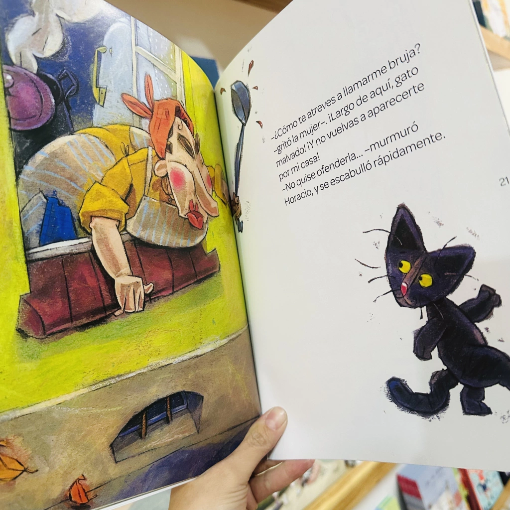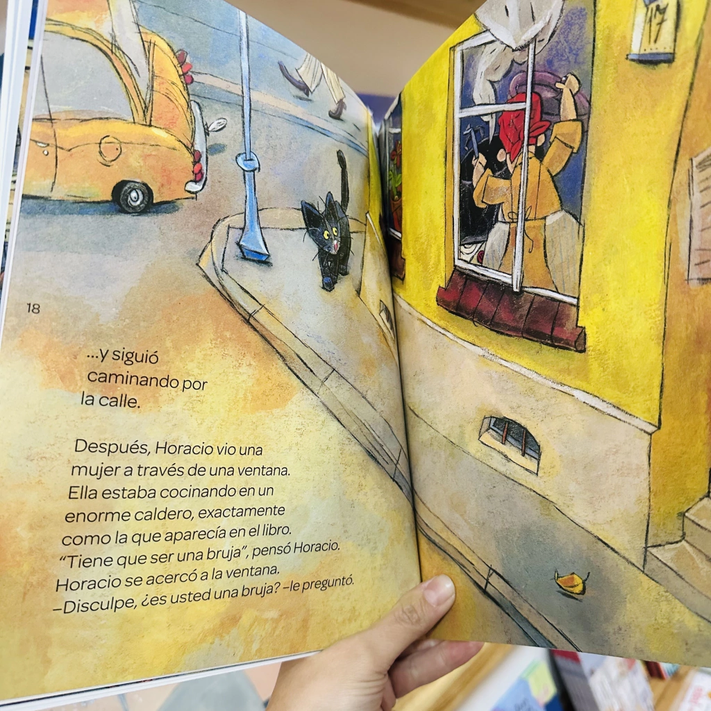 Horacio está buscando una bruja que lo cuide. Horacio es un gatito negro y solitario al que le gusta ir a leer a la biblioteca pública. Un día descubre en un libro que las mascotas preferidas de las brujas son los gatos negros. Ilusionado con la idea de que ya no tendrá frío nunca más y que no se volverá a sentir tan solo, sale en busca de una bruja que quiera adoptarlo. A diferencia de los cuentos tradicionales en los que las brujas son malvadas y nos llenan de miedo, en este relato serán la compañía perfecta para el pequeño Horacio.