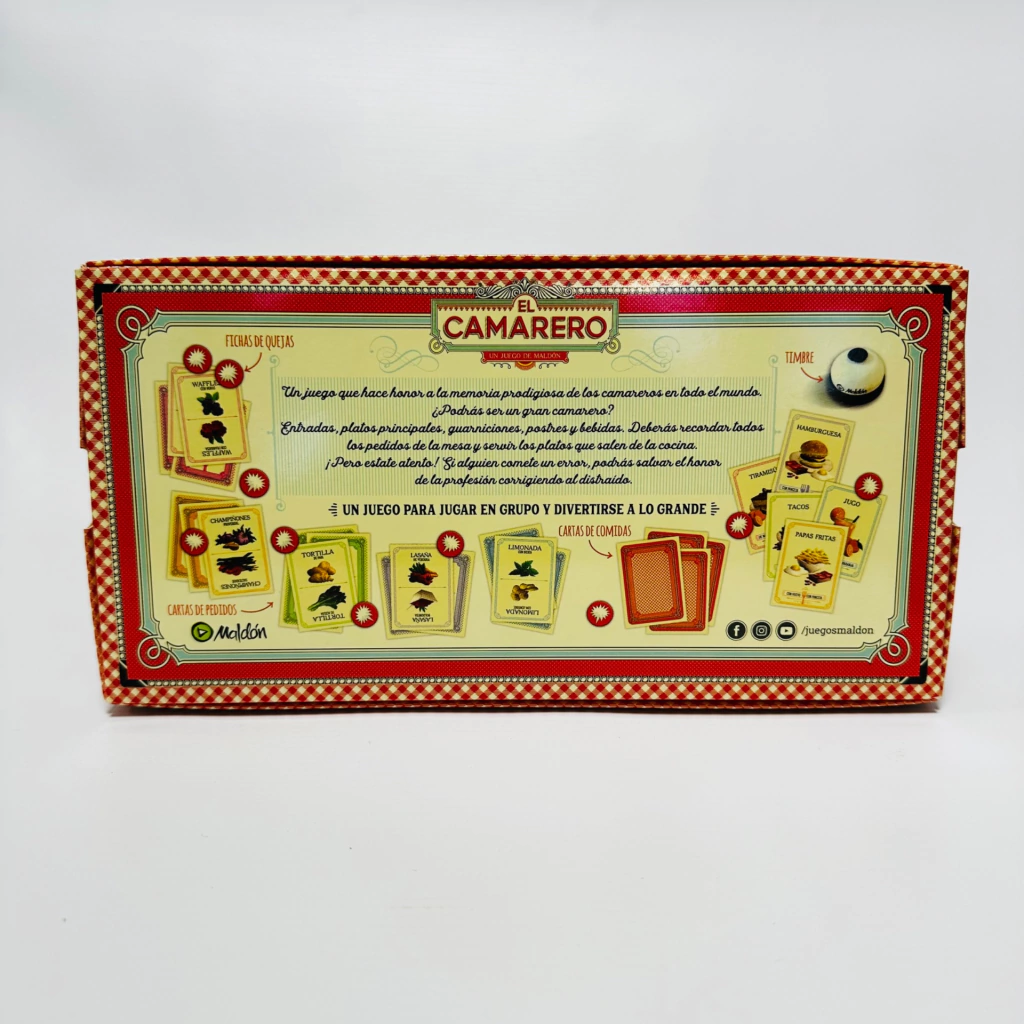 El Camarero es un juego de mesa que hace honor a la memoria prodigiosa de los camareros de todo el mundo. ¿Creés que podrías ser un gran camarero? Entradas, principales, guarniciones, postres y bebidas. Debés recordar todos los pedidos de la mesa y servir los platos que salen de la cocina. ¡Pero estate atento! Si alguien comete algún error, podés salvar el honor de la profesión corrigiendo al distraído.
