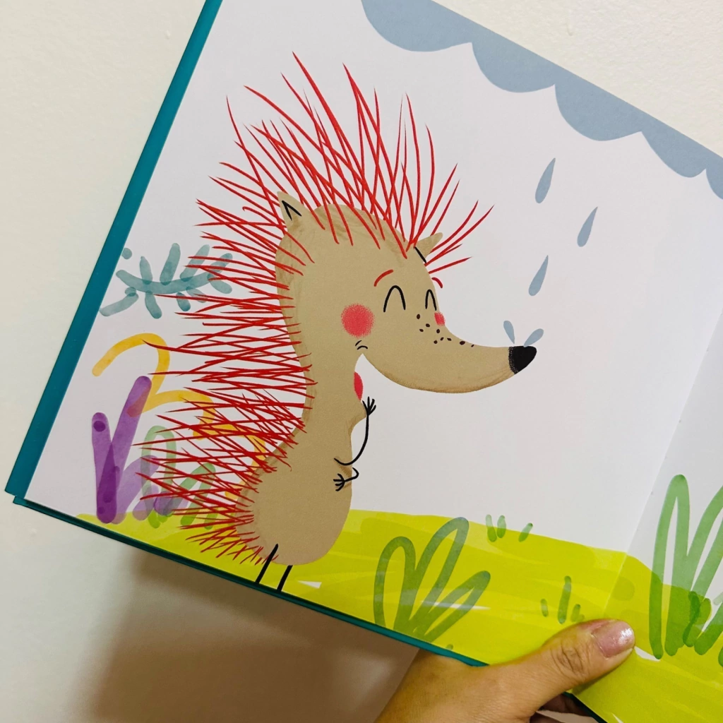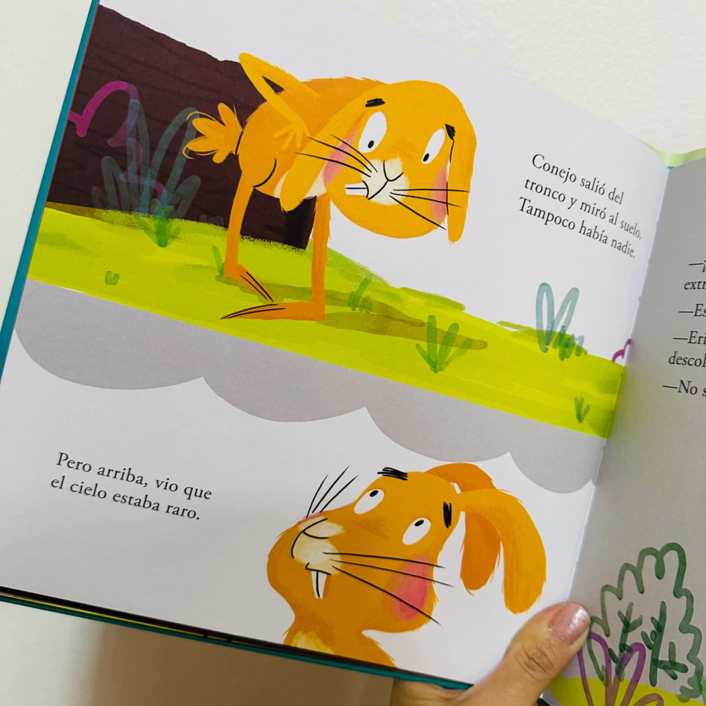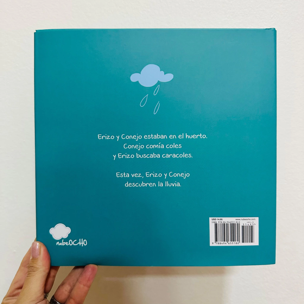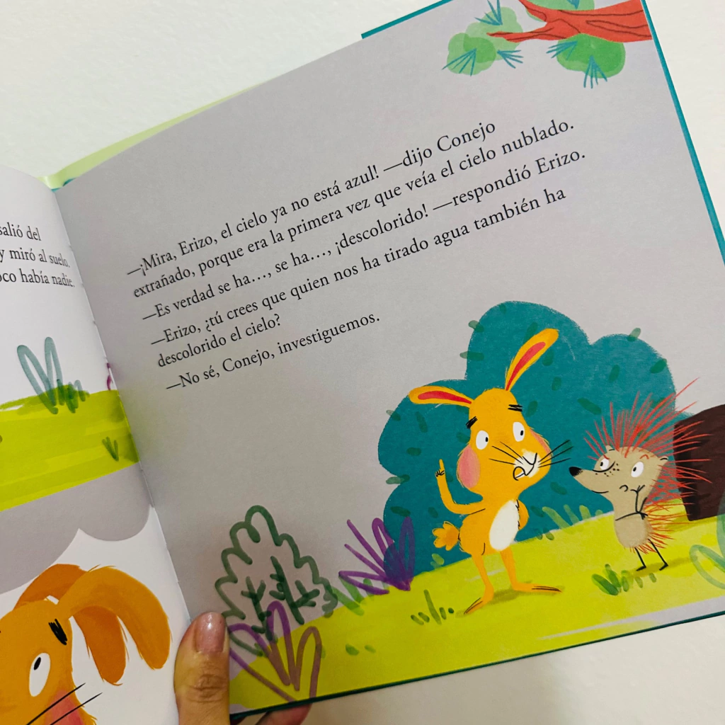 A Erizo y Conejo les cae una gota de lluvia y todo el cielo se pone gris. ¿Quién les ha tirado el agua? ¿Qué le ha pasado al cielo? ¿Lo sabrá la gallina? ¿Quizás los búhos?