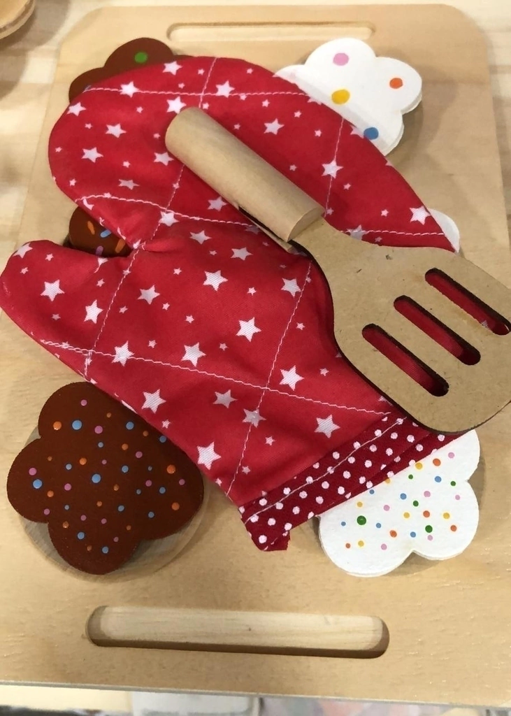 Bandeja con galletitas unidas con velcro, incluye una bandeja, una espátula de madera para levantar y guante de cocina.