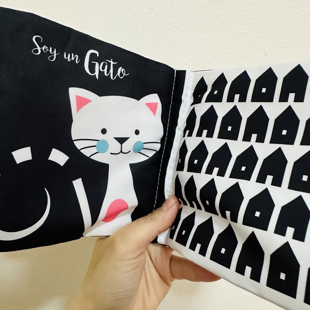 A la intensa experiencia visual y táctil se suma en esta serie la experiencia auditiva. La tapa y contratapa de estos libros de tela están rellenos de un material que cruje cuando el bebé lo