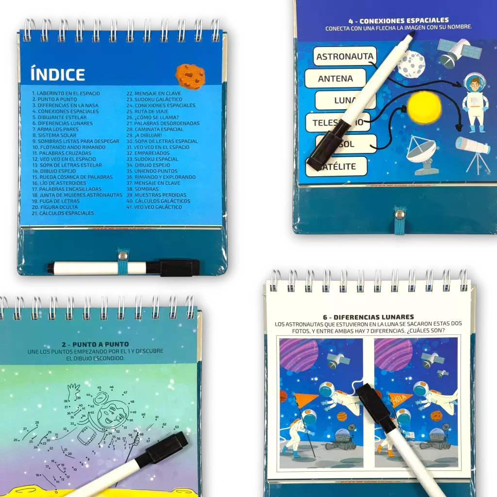 Este cuaderno didáctico es ideal para niños y niñas curiosos que quieren saber más sobre el universo. Contiene 41 actividades ilustradas con temática espacial que se pueden escribir, borrar y volver a hacer las veces que quieran.