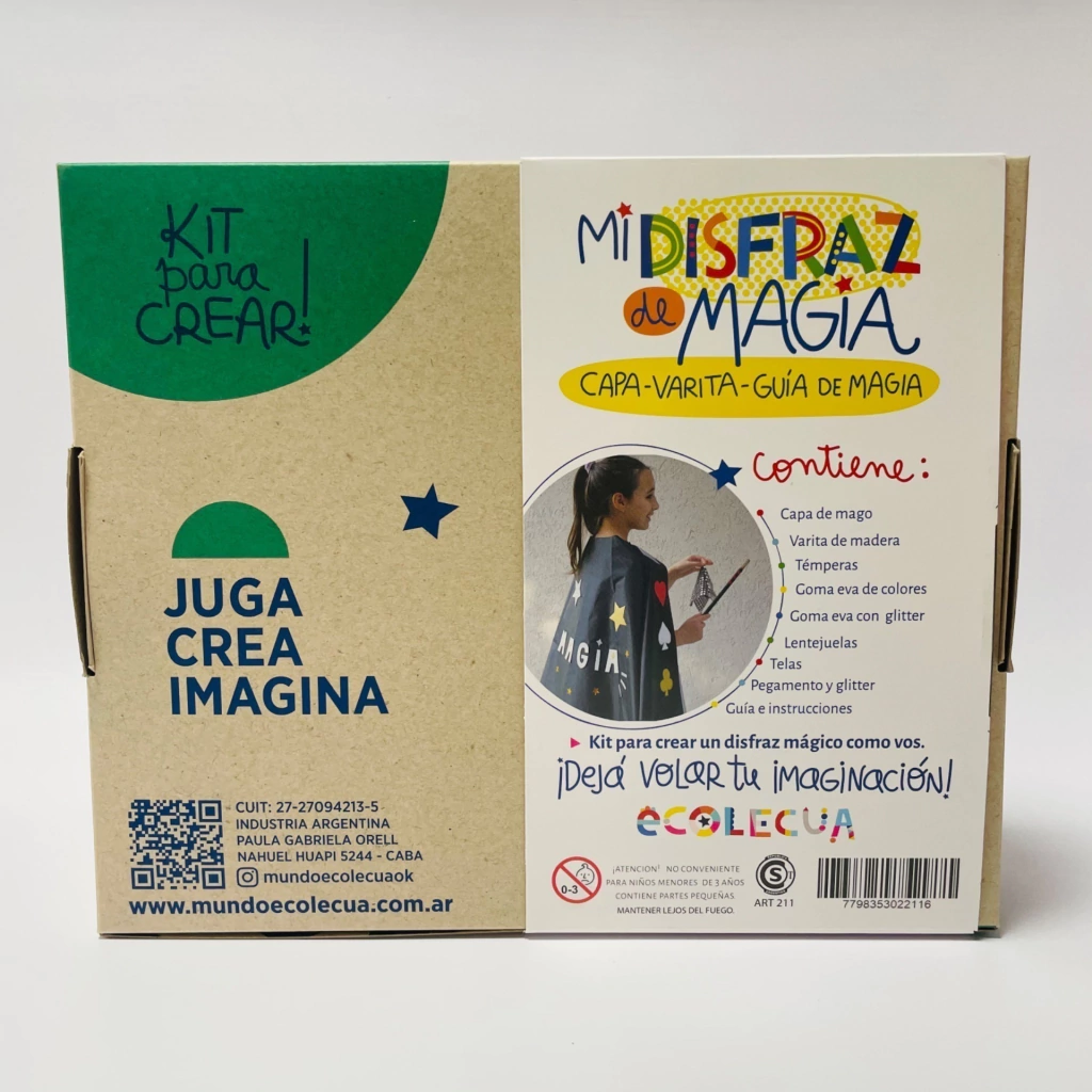 Contiene capa negra, varita de madera para pintar, temperas, goma eva de colores y con glitter, lentejuelas, pañuelo de tela, glitter, pegamento y una guia para crear un show de magia.