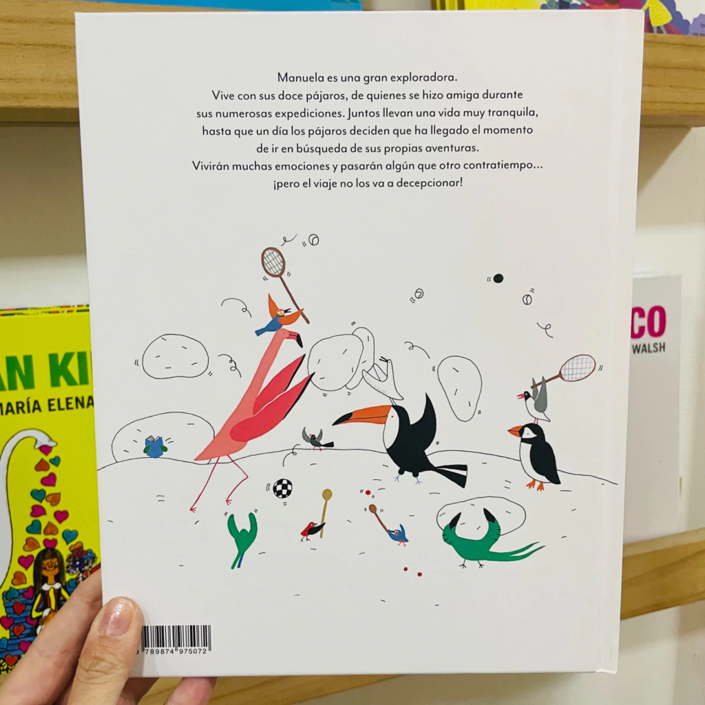 Manuela es una gran exploradora. Vive con sus doce pájaros, de quienes se hizo amiga durante sus numerosas expediciones. Juntos llevan una vida muy tranquila, hasta que un día los pájaros deciden que ha llegado el momento de ir en búsqueda de sus propias aventuras. Vivirán muchas emociones y pasarán algún que otro contratiempo… ¡pero el viaje no los va a decepcionar!