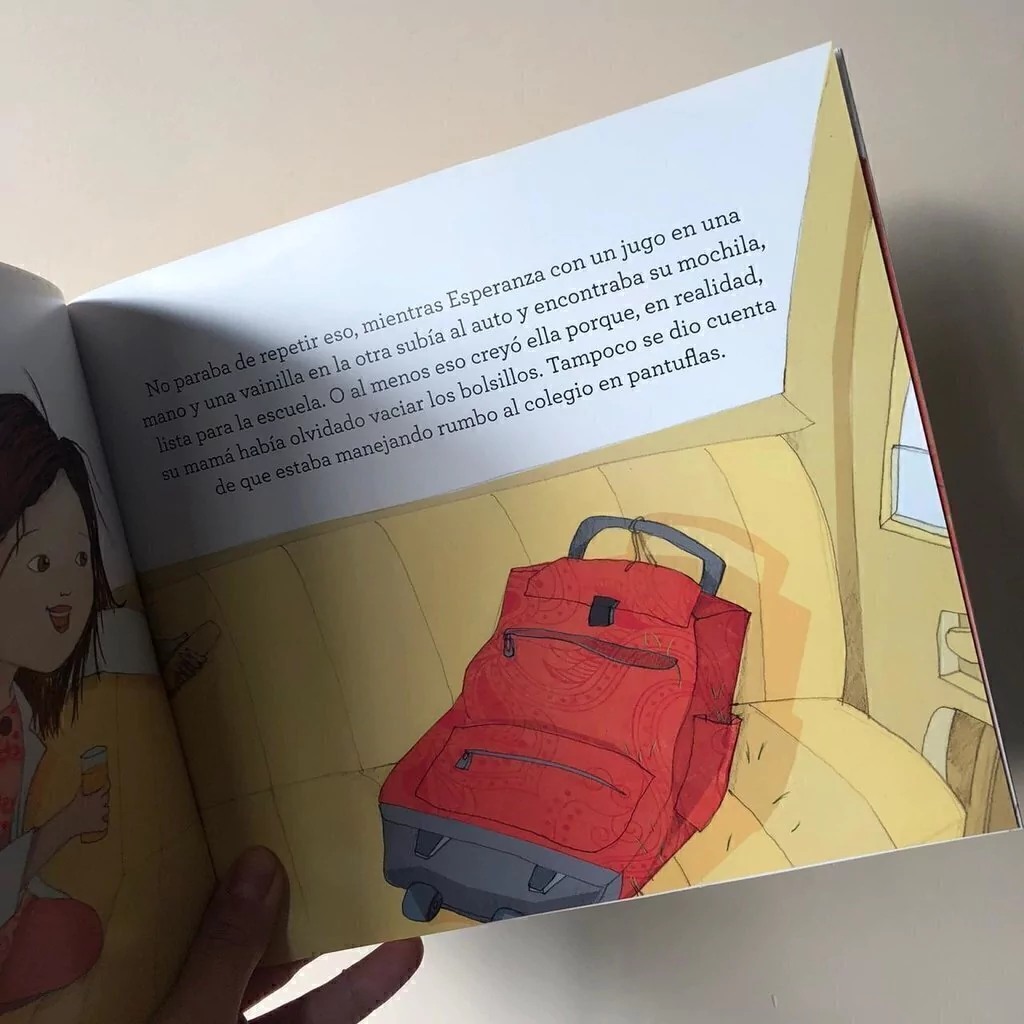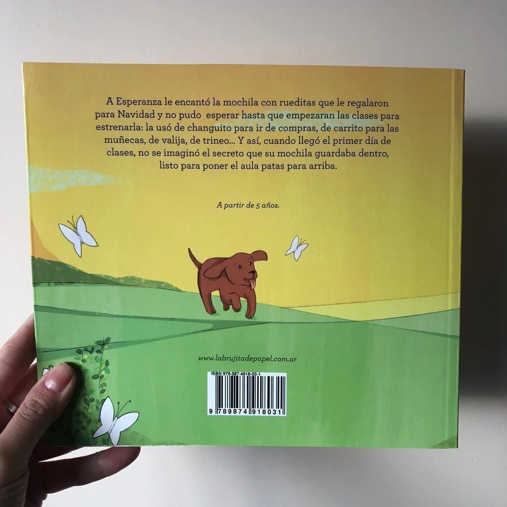 A Esperanza le encantó la mochila con rueditas que le regalaron para Navidad y no pudo esperar hasta que empezaran las clases para estrenarla: la usó de changuito para ir de compras, de carrito para las muñecas, de valija, de trineo… Y así, cuando llegó el primer día de clases, no se imaginó el secreto que su mochila guardaba dentro, listo para poner el aula patas para arriba.
