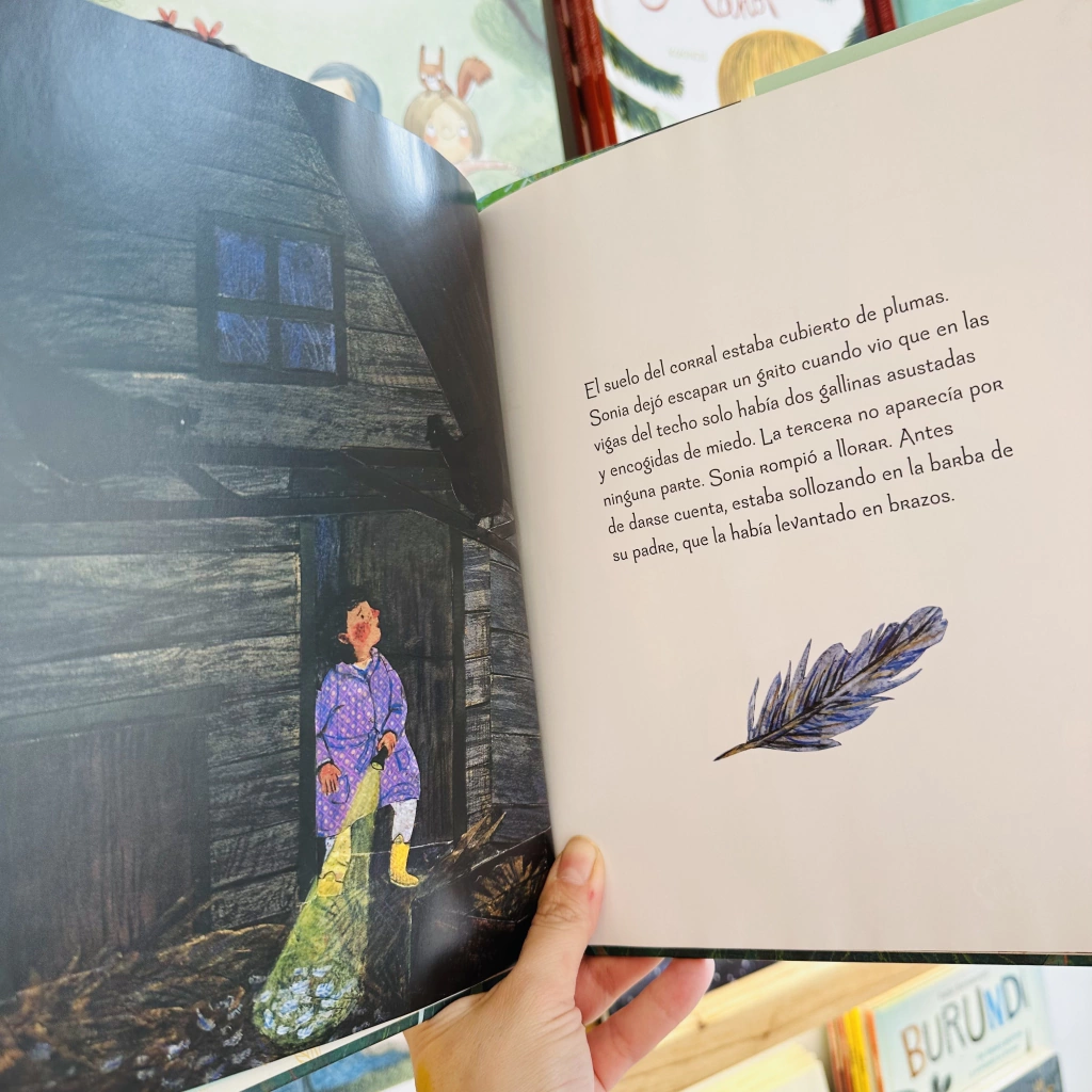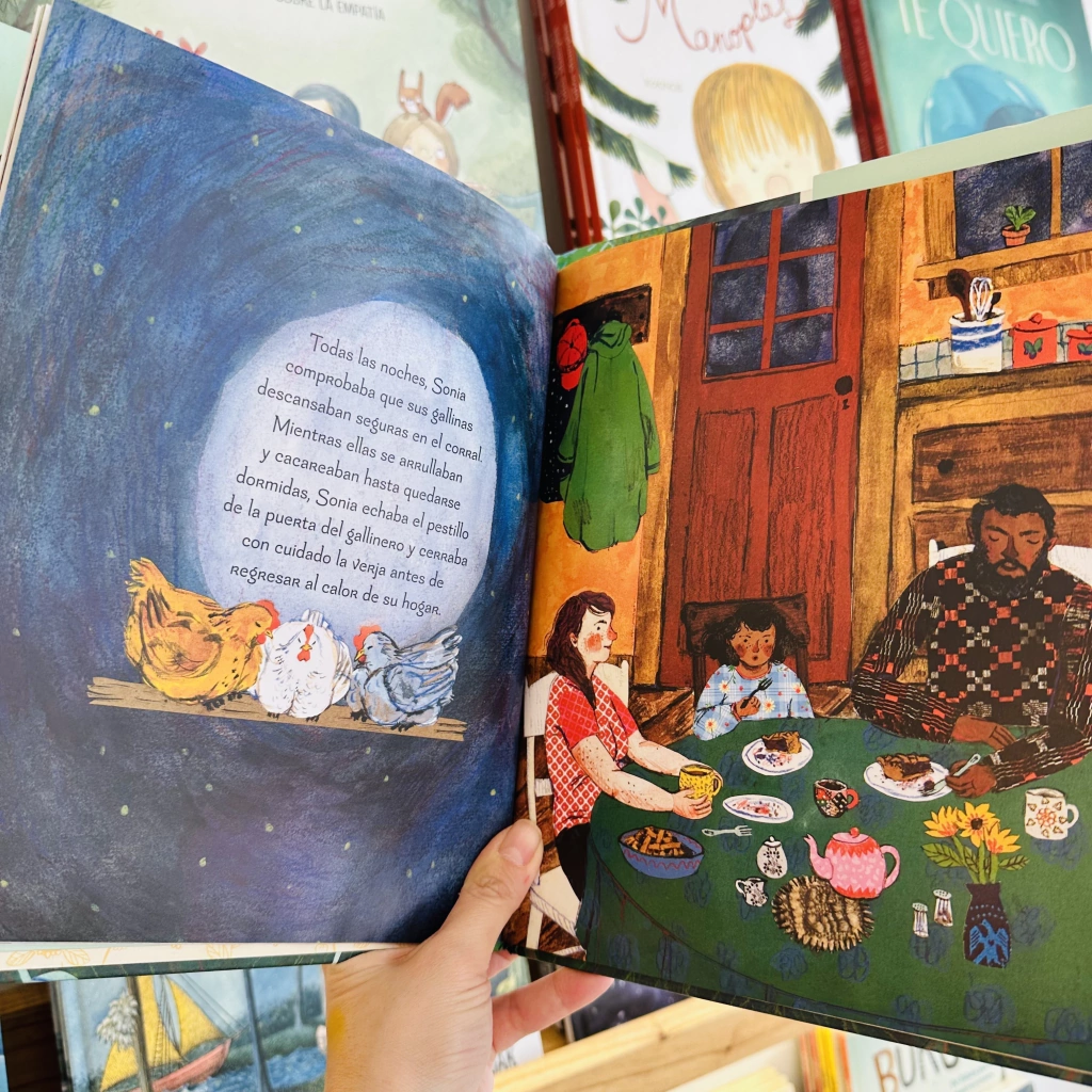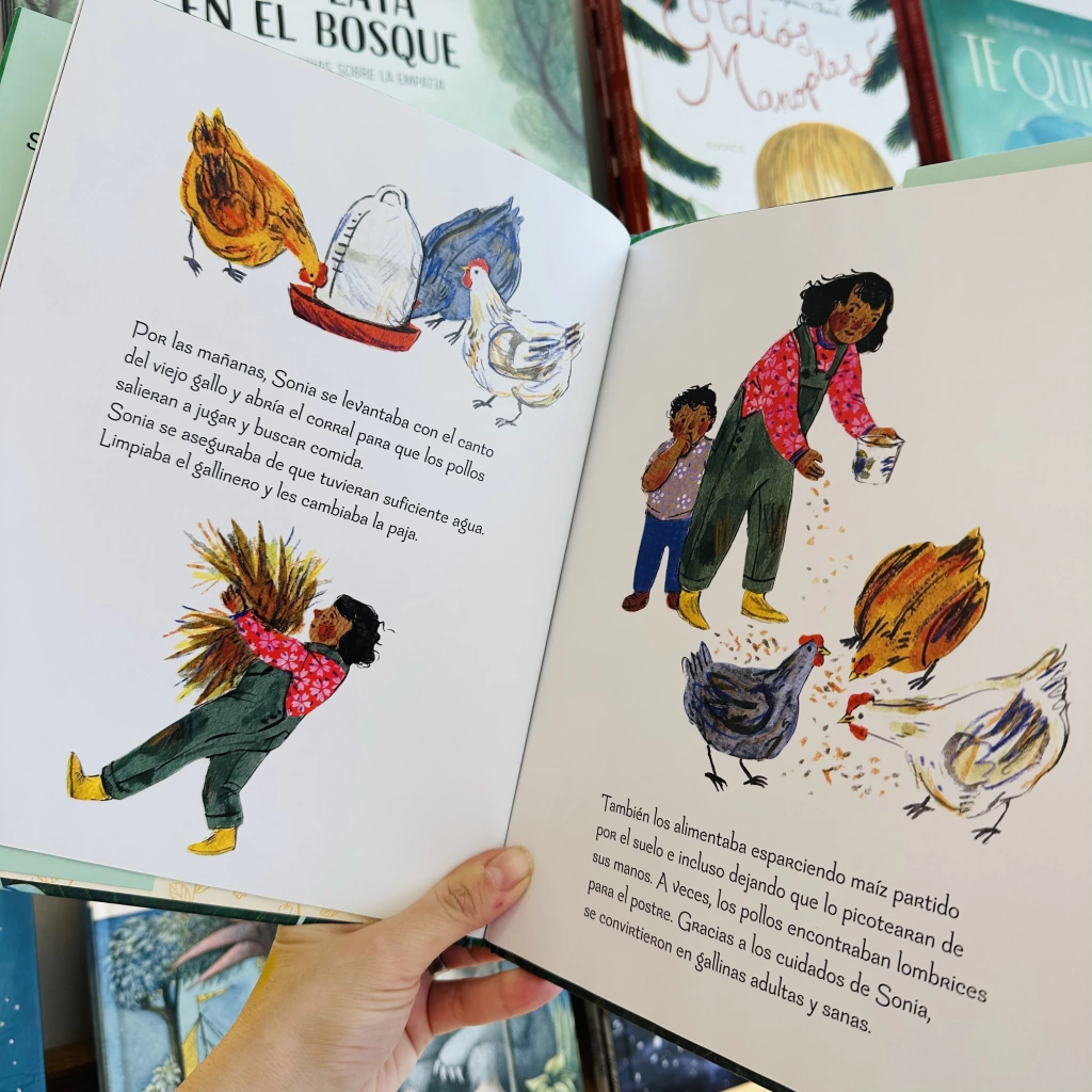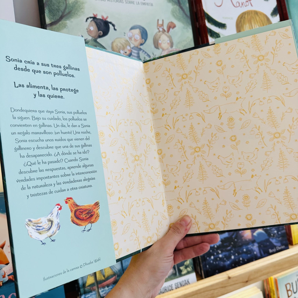 «Hay un aire vintage en esta sencilla historia de ilustraciones atemporales, creadas con acuarela, collage y lápiz de color y recuerdan a Buenas noches, luna, en el estado de ánimo, diseño y paleta. —Starred Review, Kirkus Reviews Sonia cría a sus tres pollos desde que son pollitos. Los alimenta, los protege y los quiere. Dondequiera que vaya Sonia, sus polluelos la siguen. Bajo su cuidado, los polluelos se convierten en gallinas e incluso le dan a Sonia un regalo maravilloso: ¡un huevo! Una noche, Sonia escucha ruidos provenientes del gallinero y descubre que una de sus gallinas ha desaparecido. ¿A dónde se ha ido? ¿Qué le ha pasado? Cuando Sonia descubre las respuestas, aprende algunas verdades importantes sobre la interconexión de la naturaleza y las verdaderas alegrías y tristezas de cuidar a otra criatura. Las gallinas de Sonia es una bonita historia sobre el amor y la pérdida que nos presenta de una forma amable y tierna el ciclo de la vida.