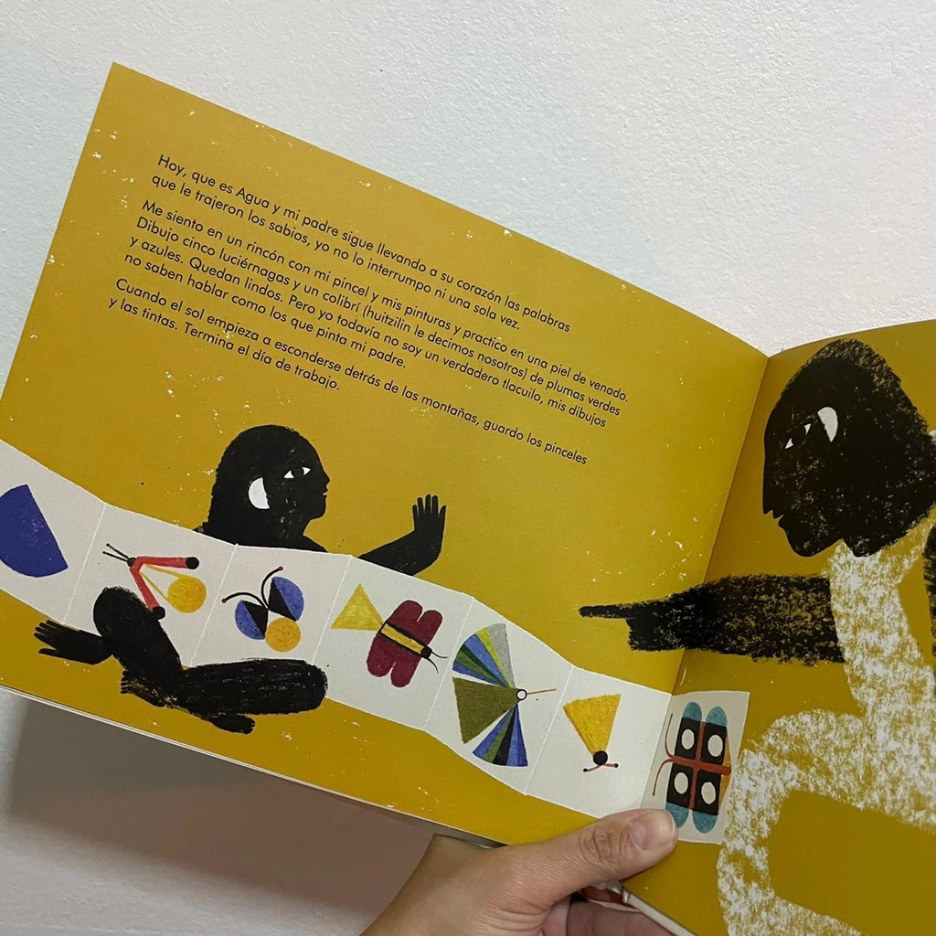 Mi papá es un tlacuilo. Para mí, el oficio de mi padre es el más lindo del mundo porque los tlacuilos pintan palabras. Él me enseña lo que sabe porque cuando yo sea grande también seré un tlacuilo.