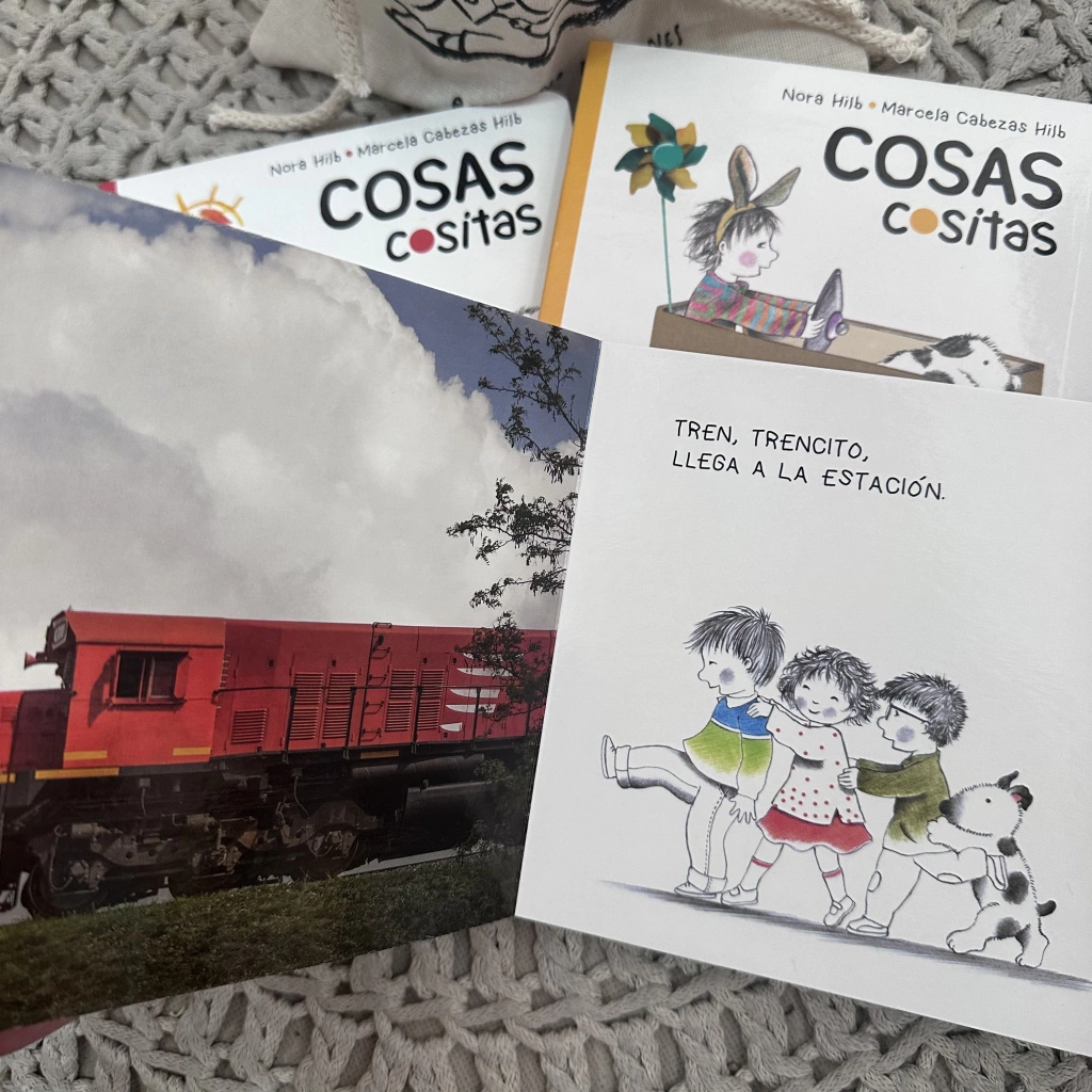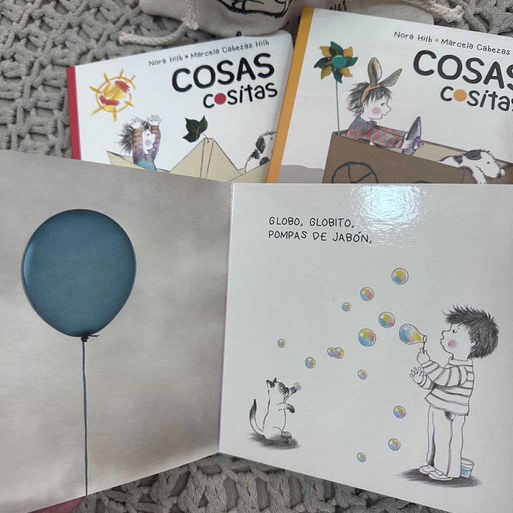 Una opción hermosa para los primeros libritos del bebé Bolsita de tela + 3 libritos cartoné para primera infancia COSAS COSITAS ROJO, AZUL y AMARILLO Escritos e ilustrados por Nora Hilb Y fotografías de Marcela Hilb Editado por BetyGino