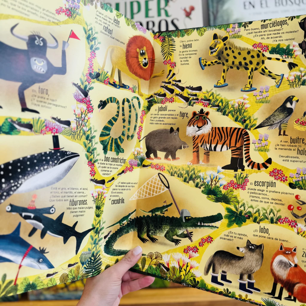 MUCHOS, MUCHOS, MUCHÍSIMOS ANIMALES Libro de gran formato para conocer a multitud de animales. Una alocada enciclopedia de animales colosales, diminutos, blancos y negros, peligrosos Totalmente reales y presentados con humor. ¡Encuéntralos a todos! Conoce el nombre y aspecto de doscientos animales con este gracioso libro de gran formato.
