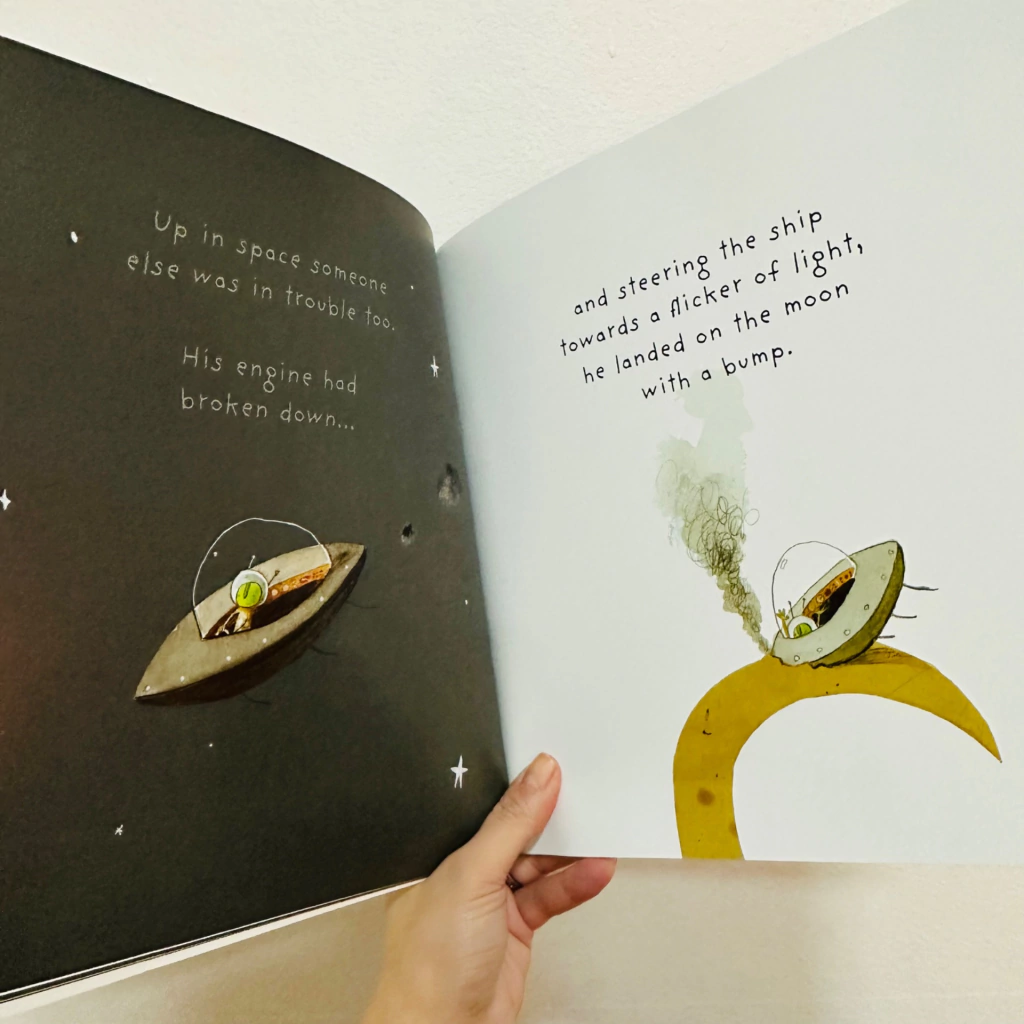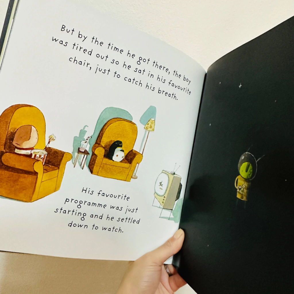 An exciting intergalactic adventure from shining star Oliver Jeffers, creator of Lost and Found. One day a boy finds an aeroplane in his cupboard. Up, up, up and away he flies, high into the sky. Whizzing past clouds, stars and planets until suddenly, he runs out of petrol! Miles from earth, the boy crashes into the moon and waits. Just as he is beginning to get cold and lonely, a friendly martian appears from the darkness, also with a broken aircraft. Together they come up with a super plan to float the boy back down to earth to collect his toolbox. Can the boy find his way back home safely and will he ever make it back up to the moon to rescue his friend?
