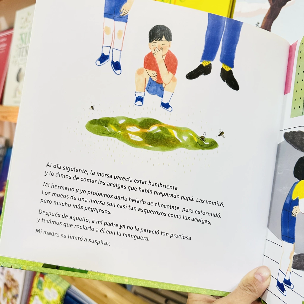 Cuando una morsa aterriza en el jardín de una plácida familia, es difícil conseguir que se sienta cómoda. Hay que alimentarla con montañas de peces y crustáceos y ponerle un nombre, buscarle un lugar donde bañarla, donde dormir… Pero los habitantes de la casa, ¿seguirán sintiéndose cómodos? Con grandes dosis de humor, ironía y desparpajo, Una morsa en mi jardín es un libro a partir del cual, entre animales que vuelan en paracaídas y globos aerostáticos, se puede intentar entender qué pasa en sus hábitats naturales.