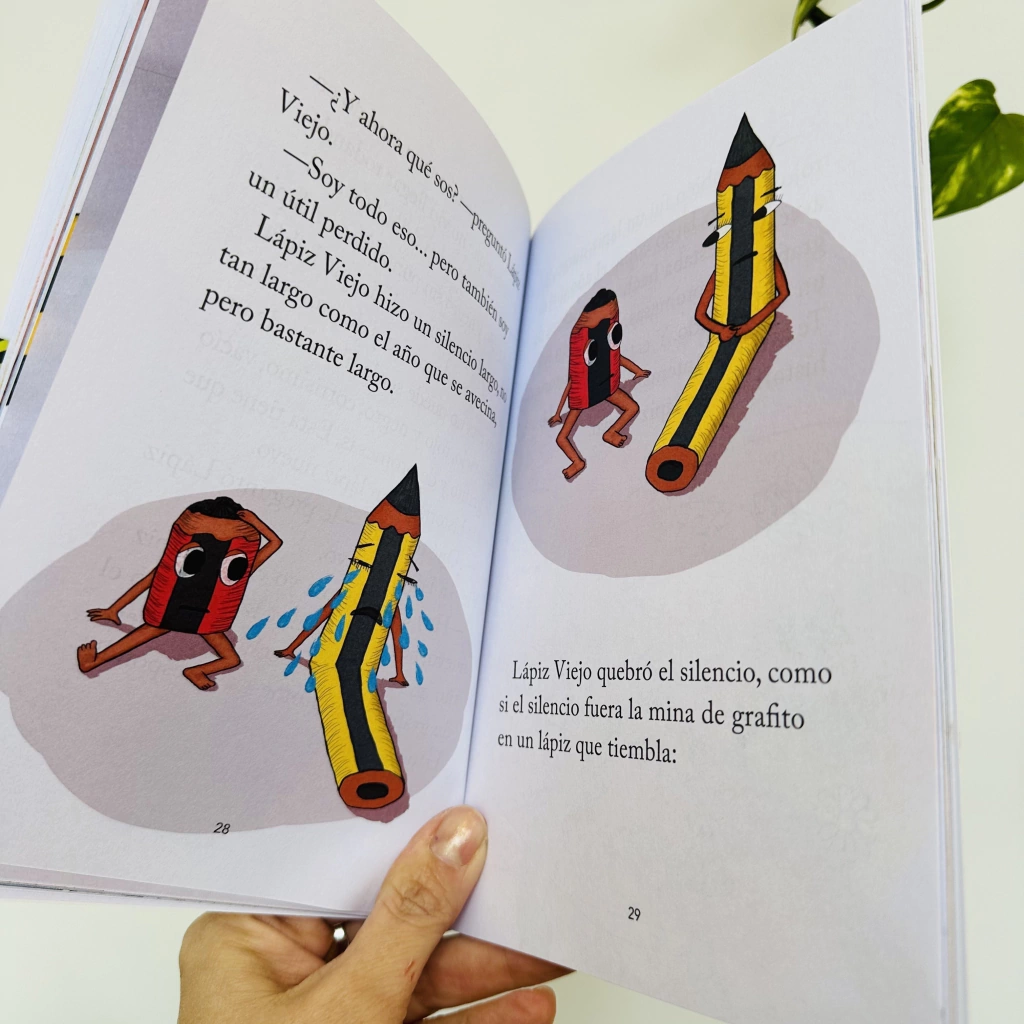 Un lápiz negro llega al aula con muchas ganas de escribir, pero ese mismo día termina temblando en la caja de útiles perdidos. Allí otro lápiz, más viejo, le contará cómo se escribió su larga historia.