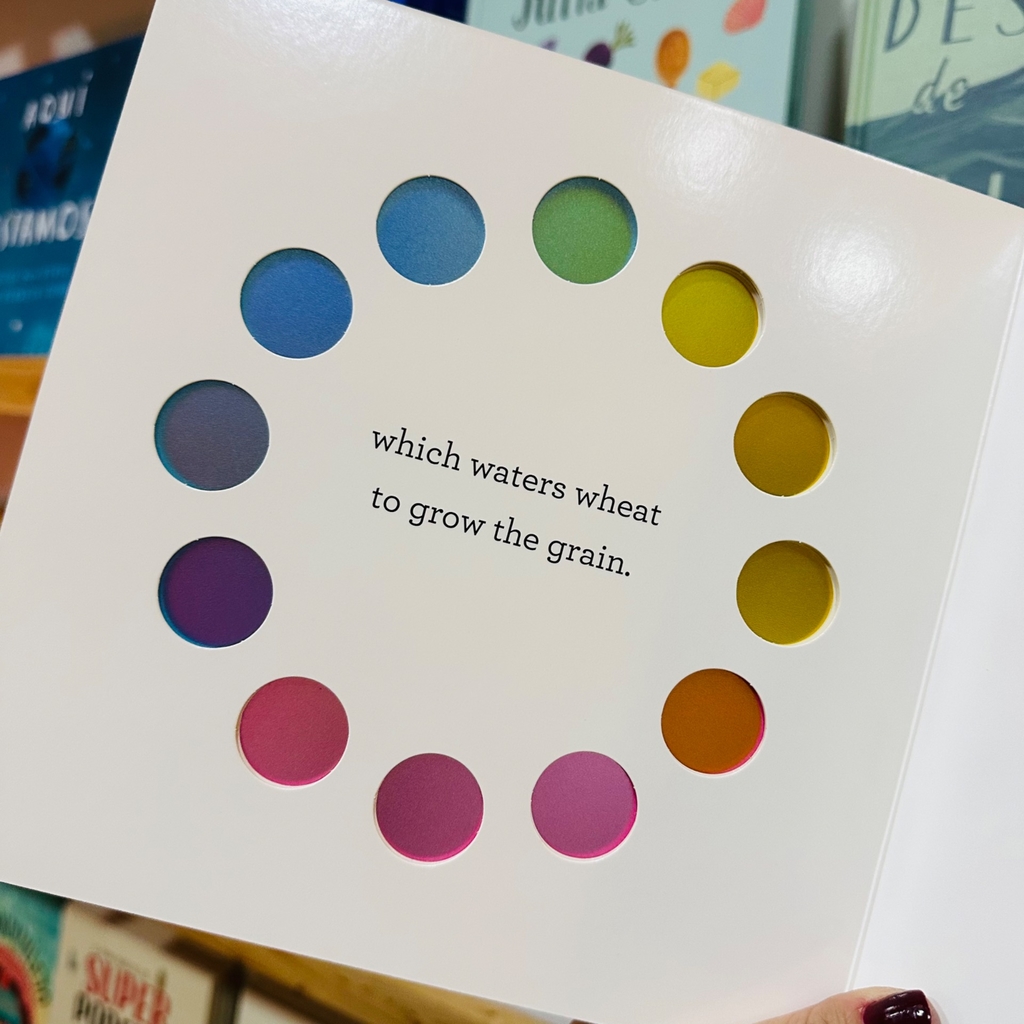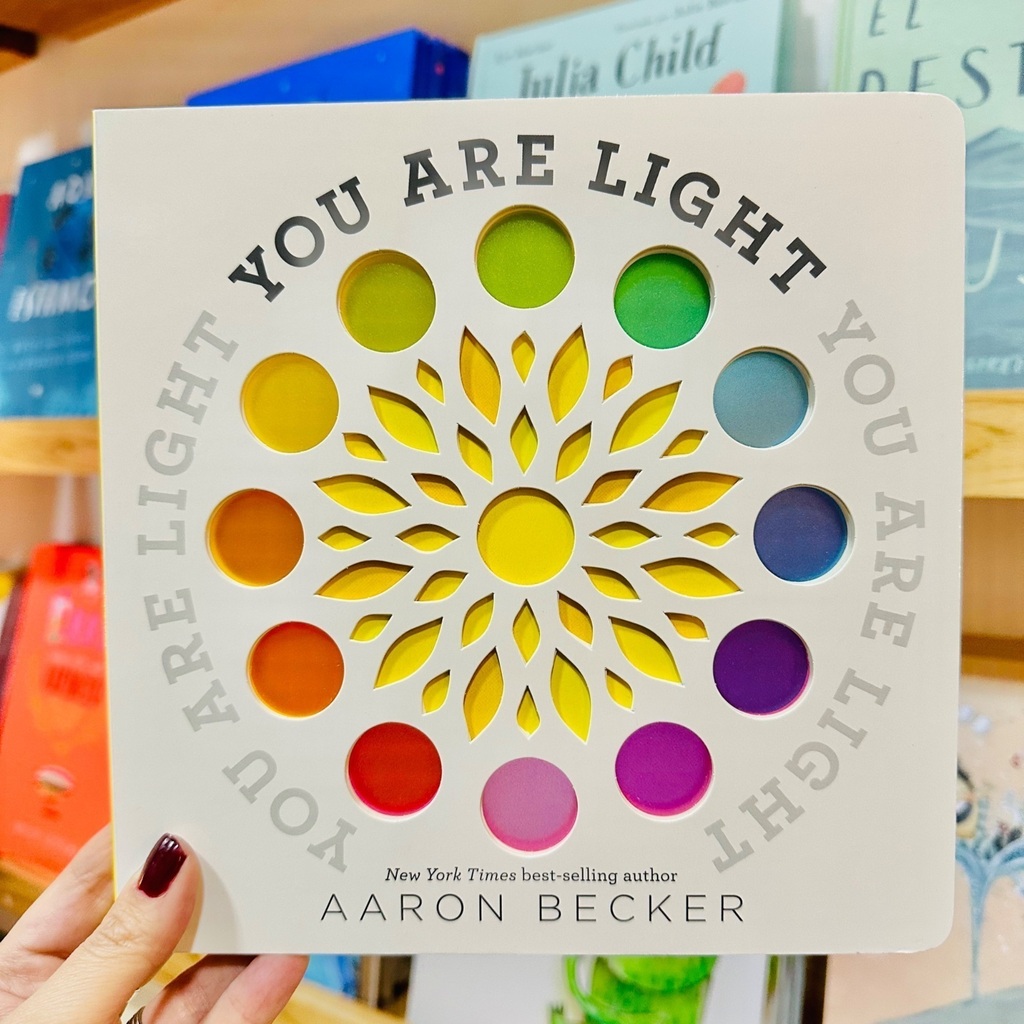 Open this beautiful book to find a graphic yellow sun surrounded by a halo of bright die-cut circles. Now hold the page up to the light and enjoy the transformation as the colors in those circles glow. In an elegant, sparely narrated ode to the phenomenon of light, Aaron Becker follows as light reflects off the earth to warm our faces, draws up the sea to make the rain, feeds all the things that grow, and helps to create all the brilliant wonders of the world, including ourselves.